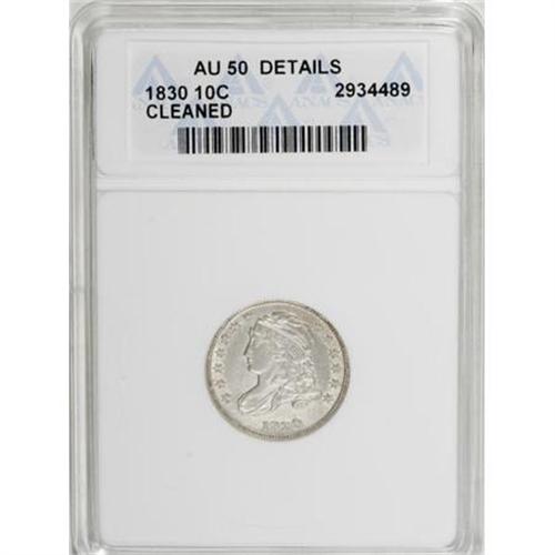 <B>1830 10C Medium 10C--Cleaned--ANACS. AU50 Details.</B></I> NGC Census: (2/135). PCGS Population (9/134). Mintage: 510,000. Numismedia Wsl. Price for NGC/PCGS coin in AU50: $292. (#4516)<BR><BR><B>Coin Engraver:</B> John Reich<BR><BR><b>Shipping:</b> Coins & Currency (<a target="_blank" href="http://www.heritageauctions.com/common/shipping.php">view shipping information</a>)