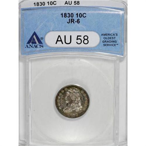 <B>1830 10C Medium 10C AU58 ANACS.</B></I> JR-6. NGC Census: (22/101). PCGS Population (15/94). Mintage: 510,000. Numismedia Wsl. Price for NGC/PCGS coin in AU58: $383. (#4516)<BR><BR><B>Coin Engraver:</B> John Reich<BR><BR><b>Shipping:</b> Coins & Currency (<a target="_blank" href="http://www.heritageauctions.com/common/shipping.php">view shipping information</a>)