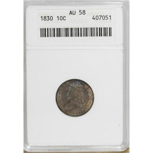 <B>1830 10C Medium 10C AU58 ANACS.</B></I> . NGC Census: (22/102). PCGS Population (15/94). Mintage: 510,000. Numismedia Wsl. Price for NGC/PCGS coin in AU58: $383. (#4516)<BR><BR><B>Coin Engraver:</B> John Reich<BR><BR><b>Shipping:</b> Coins & Currency (<a target="_blank" href="http://www.heritageauctions.com/common/shipping.php">view shipping information</a>)