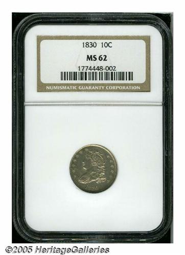 <B>1830<10C> Medium 10C MS62 NGC.</B></I> JR-8, R.3. The digit 3 in the date is low, and the pales of the third gules stripe are welded at the top on this variety. Silver-gray surfaces display hints of light tan color, and the design elements are well struck. Numerous very tiny contact marks are scattered about, particularly on the obverse.