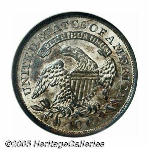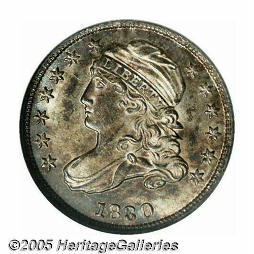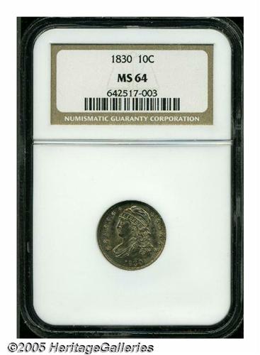 <B>1830<10C> Medium 10C MS64 NGC.</B></I> JR-6, R.2. A fairly common variety but somewhat difficult to locate in Uncirculated grades. This piece is obviously one of the finest examples known of the variety. Sharply struck on the obverse, the reverse is less so, and each side has bright mint luster beneath golden-brown and blue toning.
