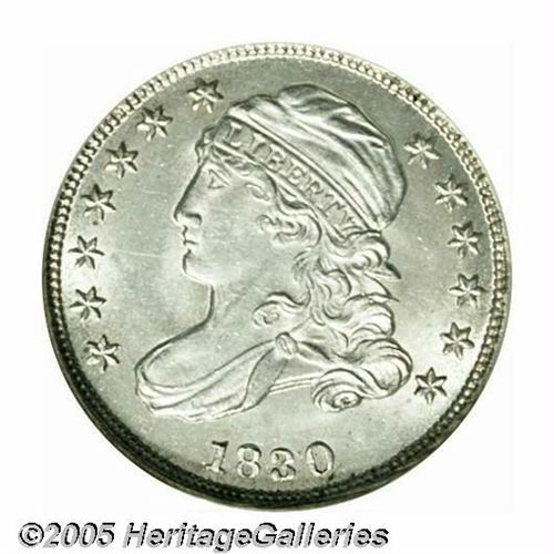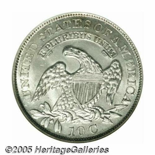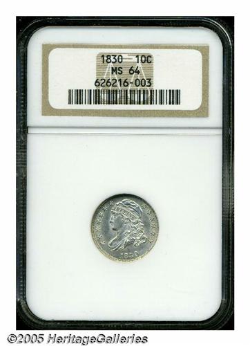<B>1830<10C> Medium 10C MS64 NGC.</B></I> JR-8, R.3. A crisply struck and virtually brilliant Choice Capped Bust Dime, fully lustrous and carefully preserved. Not quite fully struck on the fletchings and on the curl beneath the B in LIBERTY, but the strike is certainly above average for the type. The 3 in the date and the D in UNITED are entered low on the relatively scarce JR-8 die pairing.
