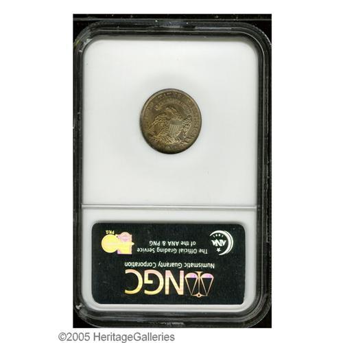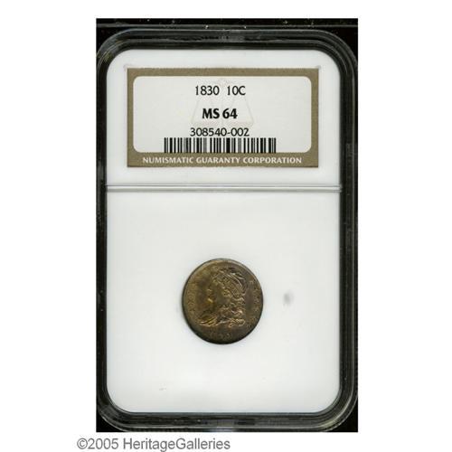 <B>1830<10C> Medium 10C MS64 NGC.</B></I> JR-8, R.3. Pleasing apricot and plum colors enrich this magnificently struck and lustrous near-Gem. A few minor marks on the portrait are trivial for the assigned grade, since the remainder of the piece is gorgeously preserved. The high 8 in the date and the vertical die crack on the neck curls are diagnostic for JR-8.