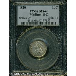 <B>1830<10C> Medium 10C MS64 PCGS.</B></I> JR-8, R.3. This reverse is sometimes also known as Large 10C as listed in the <I>Guide Book.</B></I> A Choice Mint State example; this dime is sharply struck with subdued frosty luster and pale ale toning. The JR-8 variety is somewhat scarce, although several Mint State examples have been seen. Even so, this is a lovely example for the specialist's collection. <BR><BR><B>Important notice:</B> Heritage usually auctions material at the rate of 200-250 lots per hour. On some occasions eBay Live bid software or the Internet may not be able to keep up with the pace of the auction. We recommend placing a realistic absentee bid now as insurance to avoid disappointment. Occasionally the auctioneer may eliminate or reject an eBay Live bid, and the auctioneer may also reopen a lot after the close of the eBay live bidding (usually because we missed an audience bid), and may reject your bid even if it shows you as the winning bidder. By bidding via eBay Live, you agree that Heritage may award the lot to another bidder at its sole discretion under the circumstances described above or any other reasonable circumstances. Since eBay bids are not shown to us until we open the lot on the floor, we treat those bids just like floor bids. In most cases the floor responds before the eBay bid is presented to us, due to Internet lag time, so for consistency we have made it a policy that floor bids are always considered first over tie eBay live bids. Also please note that all Heritage lots purchased through eBay Live carry a 20% Buyer's Premium. Please make sure you read the Terms and Conditions before you bid.