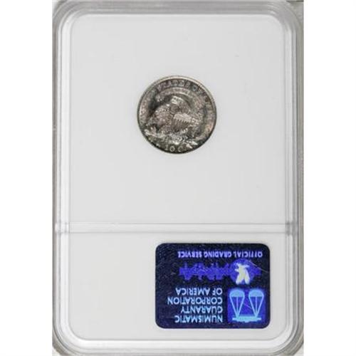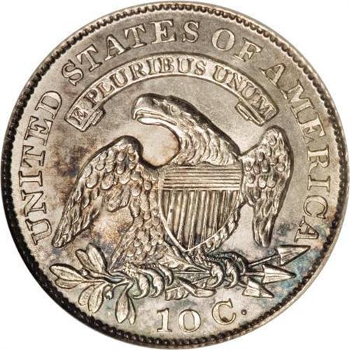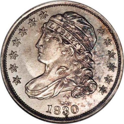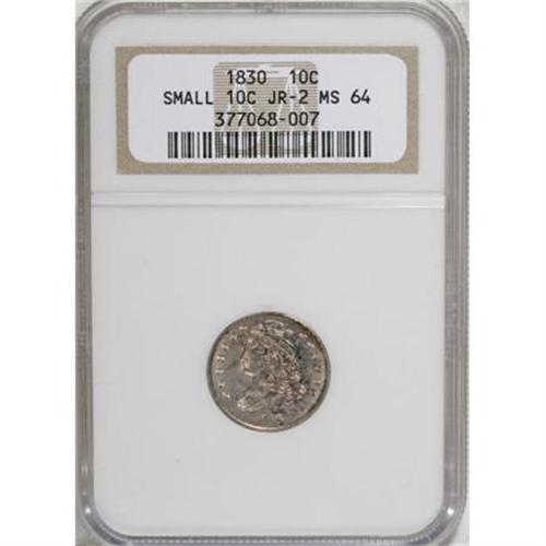 <B>1830 10C Small 10C MS64 NGC.</B></I> JR-2, R.1. The most common die pairing for the date, but a coin that is seldom located in the finer grades of Mint State. This somewhat prooflike example is boldly detailed on the obverse and displays normal weakness on the eagle's neck feathers. Splashes of violet and mint-green toning are noticed on each side.<BR><BR><B>Coin Engraver:</B> John Reich<BR><BR><b>Shipping:</b> Coins & Currency (<a target="_blank" href="http://www.heritageauctions.com/common/shipping.php">view shipping information</a>\)