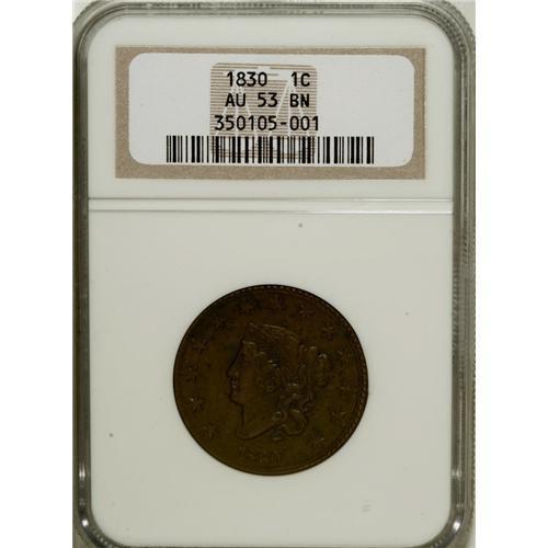 <B>1830 1C Large Letters AU53 NGC.</B></I> NGC Census: (10/112). PCGS Population (4/41). Mintage: 1,711,500. Numismedia Wsl. Price for NGC/PCGS coin in AU53: $300. (#1672)<BR><BR><b>Shipping:</b> Coins & Currency (<a target="_blank" href="http://www.heritageauctions.com/common/shipping.php">view shipping information</a>)