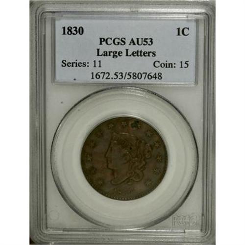 <B>1830 1C Large Letters AU53 PCGS.</B></I> PCGS Population (4/46). NGC Census: (4/60). Mintage: 1,711,500. Numismedia Wsl. Price for NGC/PCGS coin in AU53: $300. (#1672)<BR><BR><B>Coin Engraver:</B> Robert Scot or John Reich<BR><BR><b>Shipping:</b> Coins & Currency (<a target="_blank" href="http://www.heritageauctions.com/common/shipping.php">view shipping information</a>)