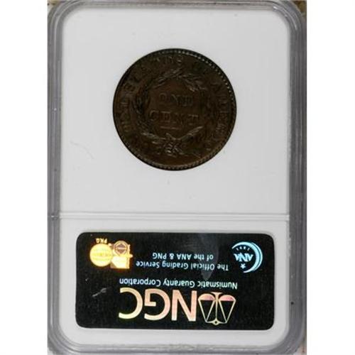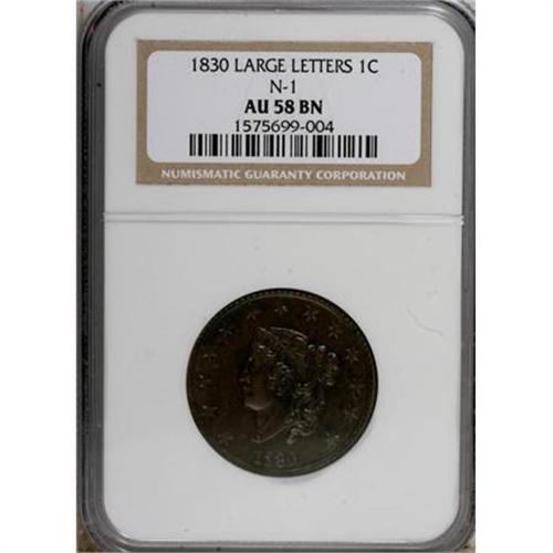 <B>1830 1C Large Letters AU58 NGC.</B></I> N-1. NGC Census: (9/33). PCGS Population (9/22). Mintage: 1,711,500. (#1672)<BR><BR><B>Coin Engraver:</B> Robert Scot or John Reich<BR><BR><b>Shipping:</b> Coins & Currency (<a target="_blank" href="http://www.heritageauctions.com/common/shipping.php">view shipping information</a>)