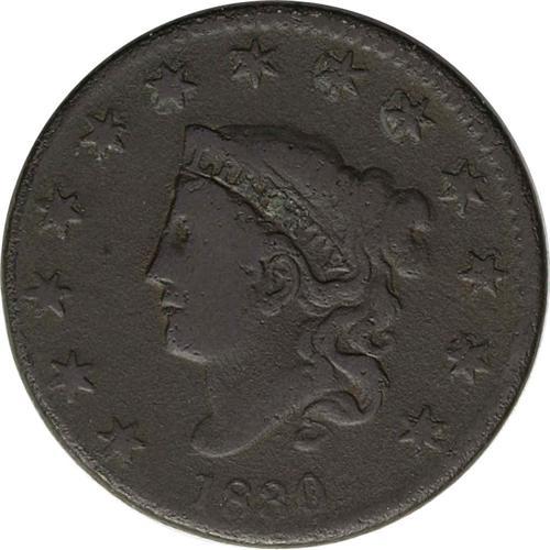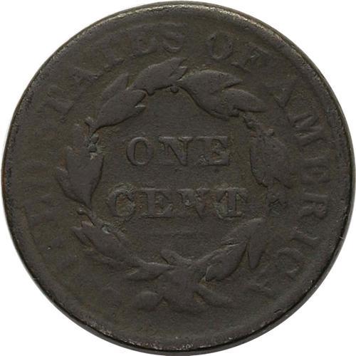 <B>1830<1C> Large Letters. N-11, R.5--Corroded--NCS. Fine Details. Good 5 EAC.</B></I> This rare variety mules the dies for the N-8 obverse and N-4 reverse. All legends are distinct, but the dark gray surfaces are granular to the point that UNITED STATES OF AMERICA is blurry, although it remains fully legible.<BR><I>Ex: Darwin B. Palmer, Jr. (12/14/1981).</B></I> Envelope Included.
