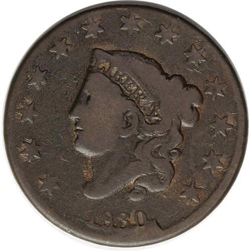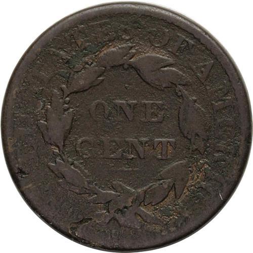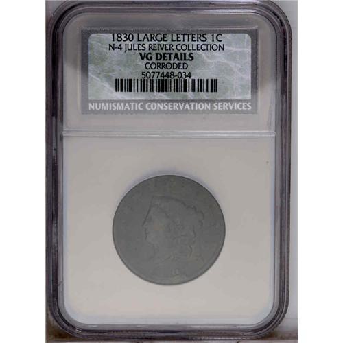 <B>1830<1C> Large Letters. N-4, R.2--Corroded--NCS. VG Details. Good 4 EAC.</B></I> Jules Reiver purchased this piece for its large cud beneath the 830 in the date. On the reverse, a bold, straight die crack travels from the rim at 8 o'clock to the C in CENT, not seen on the previous lot. Fine horizontal lines on the portrait suggest a past brushing. This rough dark brown piece should prove an affordable example of this dramatic and presumably rare late die state.<BR><I>Ex: Thomas Warfield (Associated Coin Auctions, 10/1955), lot 525; Willard C. Blaisdell (9/1976); R.E. Naftzger, Jr.; EAC Sale (4/1989), lot 314; Dennis Mendelson (Superior, 2/3/1991), lot 397.</B></I> Envelope Included.