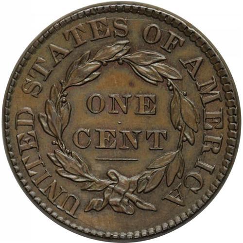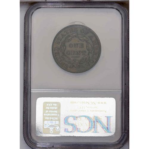 <B>1830<1C> Large Letters. N-4, R.2--Improperly Cleaned--NCS. Unc. Details. AU50 EAC.</B></I> Light brown color is deceptive and any hairlines are extremely faint. A light fingerprint fragment is near star 12. Well struck except for the left side stars. Handling marks are very few and none are worthy of discussion. Struck a couple of degrees off center toward 9 o'clock. A suitable example of this Large Letters marriage.<BR><I>Ex: George Ramont.</B></I> Envelope Included.