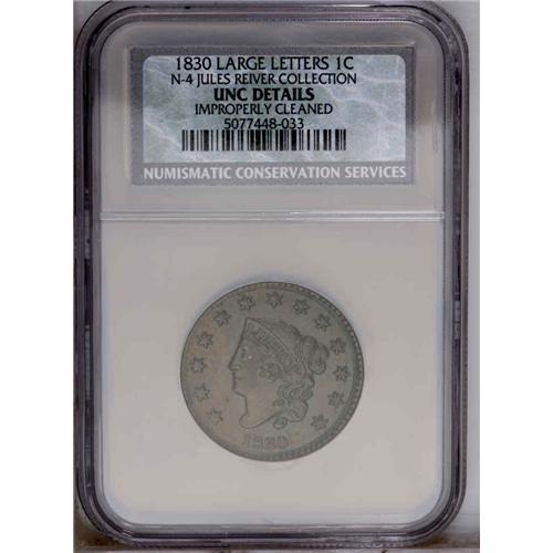 1830 1C Large Letters--Improperly Cleaned--NCS. Unc. D 1830[1C] Large Letters. N-4, R.2--Improperly