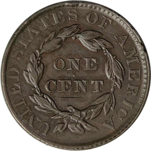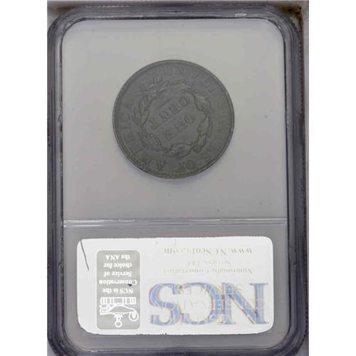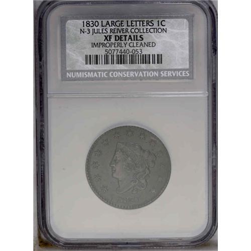 <B>1830<1C> Large Letters. N-3, R.3--Improperly Cleaned--NCS. XF Details. VF30 EAC.</B></I> No clash marks east of the denomination inside the wreath, unlike the next lot. Very faint hairlines are present on the cheek, but the deep brown toning has a natural appearance. The highpoints are steel-gray in color. A bright mark above star 9, and the reverse has minor dings above the TA in STATES and the M in AMERICA. An occasional granular spot is seen, one is above the portrait beneath star 8. AMERICA and the left side stars are bolder than the remainder of the piece due to high protective rims. Dies are rotated 150 degrees clockwise, close to medal turn.<BR><I>Ex: George Ramont (11/26/1968).</B></I> Envelope Included.