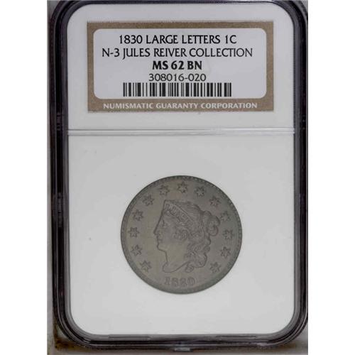 1830 1C Large Letters MS62 Brown NGC. N-3, R.3. Unlike 1830[1C] Large Letters. N-3, R.3. MS62 Brown