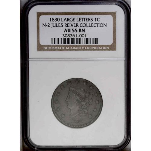 <B>1830<1C> Large Letters. N-2, High R.2. AU55 NGC. XF40 EAC.</B></I> A middle die state with strong obverse die cracks, but with the die line at U still visible. Somewhat bluntly struck. Medium brown surfaces with some darker steel and lighter tan color.<BR><I>Ex: Del Bland (7/19/1969).</B></I> Envelope Included.