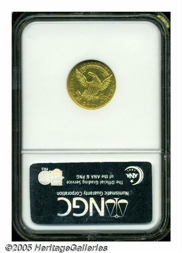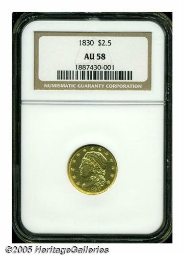 <B>1830<$2 1/2> AU58 NGC.</B></I> Only one die pairing was used to strike the 1830 Quarter Eagle, and it is identified by a repunched I in AMERICA combined with a final star distant from the border. All Capped Bust Quarter Eagles are rarities, and the 1830 is no exception. A stingy mintage of 4,540 pieces was depleted by melting on both sides of the Atlantic, since the bullion value exceeded face, even at the time of issue. Well struck save for the left border of the eagle's shield, this sunrise gold example has faint friction on the cheekbone and an unimportant rim ding at 6 o'clock. Population: 17 in 58, 22 finer (3/05).
