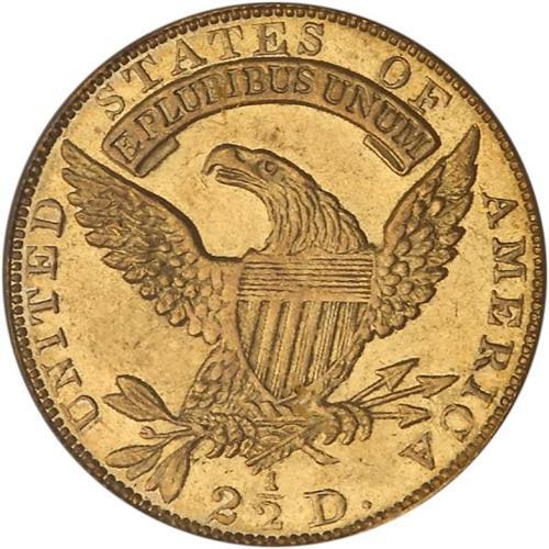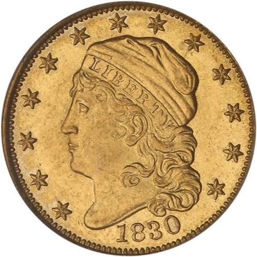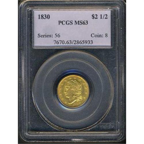 <b>1830 $2.50 Capped Head. PCGS graded MS63.</b> Only 4,450 Quarter Eagles were produced in 1830, and of that paltry number probably no more than a couple of dozen are believed to exist today in all grades. This is one of the finer pieces known. The fields have a subtle reflectivity and the striking details are generally well defined, except at the juncture of the shield and the eagle's left (facing) wing. The lustrous green-gold surfaces show a few small, scattered abrasions but none that are worthy of individual mention. Housed in PCGS holder #2865933, and last sold in a Heritage sale of 11/2001:275 where it realized $12,650.