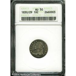 1830/29 10C AU50 ANACS. JR-5, R.2. Vivid apple-gre <B>1830/29 10C AU50 ANACS.</B></I> JR-5, R.2. Vivid apple-green and pink-mauve patina enriches this overdated Bust Dime. Substantial luster is present, and the only blemish is a short pinscratch on the left reverse field. <BR><BR><B>Important notice:</B> Heritage usually auctions material at the rate of 200-250 lots per hour. On some occasions eBay Live bid software or the Internet may not be able to keep up with the pace of the auction. We recommend placing a realistic absentee bid now as insurance to avoid disappointment. Occasionally the auctioneer may eliminate or reject an eBay Live bid, and the auctioneer may also reopen a lot after the close of the eBay live bidding (usually because we missed an audience bid), and may reject your bid even if it shows you as the winning bidder. By bidding via eBay Live, you agree that Heritage may award the lot to another bidder at its sole discretion under the circumstances described above or any other reasonable circumstances. Since eBay bids are not shown to us until we open the lot on the floor, we treat those bids just like floor bids. In most cases the floor responds before the eBay bid is presented to us, due to Internet lag time, so for consistency we have made it a policy that floor bids are always considered first over tie eBay live bids. Also please note that all Heritage lots purchased through eBay Live carry a 20% Buyer's Premium. Please make sure you read the Terms and Conditions before you bid. This lot is being auctioned in conjunction with a live floor auction by Heritage Galleries & Auctioneers. All final auction and invoice information will be supplied by Heritage Galleries & Auctioneers, and all other information should be considered preliminary. Lot:5705