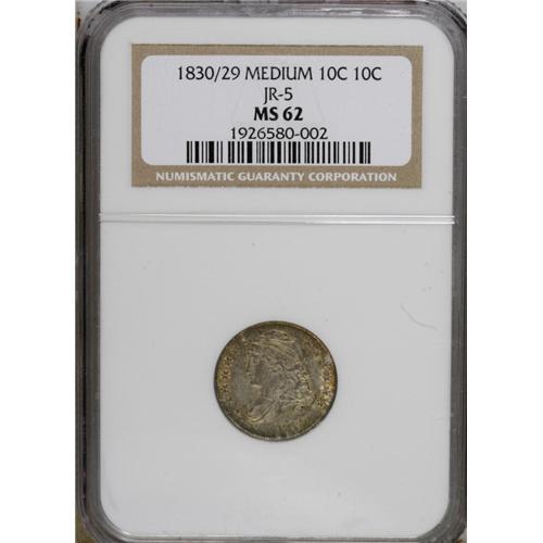 <B>1830/29 10C MS62 NGC.</B></I> JR-5, R.2. Rich golden-brown, steel-gray, and lemon-lime patination embraces this reasonably struck type coin. The reverse is undisturbed, while the obverse has a pair of bright pinscratches. Census: 4 in 62, 9 finer (1/07).<BR><BR><b>Shipping:</b> Coins & Currency (<a target="_blank" href="http://www.heritageauctions.com/common/shipping.php">view shipping information</a>)