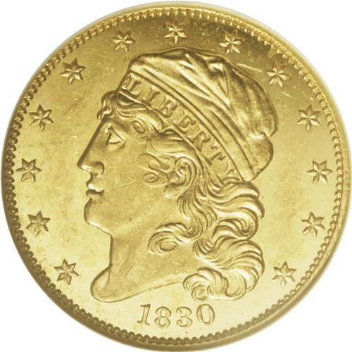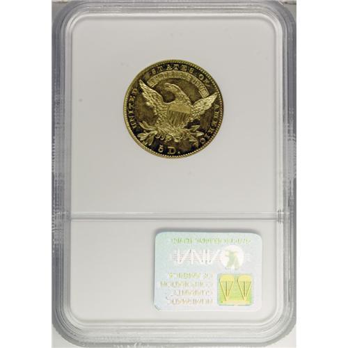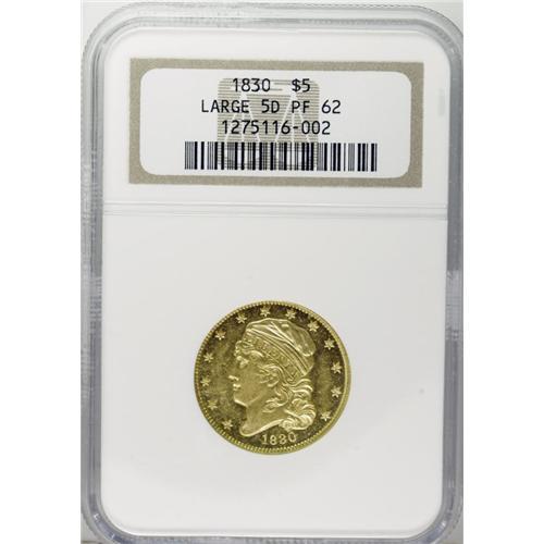 <B>1830 $5 PR62 NGC.</B></I> Large 5D. BD-1, B-1, Bass-3156, Low R.6 for the variety, R.8 as a proof. Walter Breen wrote in his <I>Encyclopedia of Proof Coins:</B></I> "One 1830 Large 5D. seen many years ago, but I have lost track of it. The variety is extremely rare even in business strike form." Breen also commented on proof examples of the other 1830 variety, the Small 5D variety: "The proof in Omaha City Library, ex Byron Reed bequest, is believed to be this variety; one other reported, known to Wayte Raymond." Nearly 30 years later, Jeff Garrett and Ron Guth combined both varieties into a single paragraph commentary in their <I>Encyclopedia of U.S. Gold Coins:</B></I> "Only two examples of the 1830 half eagle are known to exist in Proof. One resides in the Byron Reed Collection at the Durham Western Heritage Museum in Omaha, Nebraska. The other coin, an NGC PR62, currently resides in a private Northeastern collection. Neither the Bass nor the Smithsonian collection contains an 1830 half eagle in Proof. The extreme rarity of early gold Proof coins can be attributed to their high face value and a shortage of American coin collectors at the time of their mintage." This example is the NGC PR62 mentioned by Garrett and Guth, and it is also the plate coin in their reference.<BR> In addition to the pieces discussed by Breen and by Garrett and Guth, a proof example of the Small 5D variety appeared in the Eliasberg Collection, thus it appears that exactly three 1830 half eagles are currently identified as proofs, with only the presently offered piece representing the Large 5D variety, thus it is our belief that this coin is unique in proof for the variety. The following Census is established for the 1830 proof half eagles:<BR><BR><B>Small 5D.</B></I> Byron Reed Collection; Omaha City Library; transferred to Durham Western Heritage Museum.<BR><B>Small 5D.</B></I> George H. Earle (Henry Chapman, June 1912); Clapp Collection; Eliasberg Collection (Bowers and Ruddy, 10/1982), lot 390.<BR><B>Large 5D. The specimen offered here.</B></I> From a private Northeastern Collection.<BR><BR> Although the grade is limited by a few scuffs and hairlines in the fields, both sides of this piece have bright yellow-gold color. The fields are fully mirrored and the devices are lightly frosted, imparting a slight cameo appearance. The junction between the fields and devices is crisp and concise, with no evidence of mint frost in the fields at these locations. There is an appearance of satiny devices within the letters of LIBERTY and E PLURIBUS UNUM. Slight weakness of the central design detail is noted on each side. This reverse die was first used for a limited coinage of 1829 Small Diameter half eagles, then lightly lapped for use in 1830. This example is from the lapped reverse die, but exhibits no other die defects, thus must have been among the first 1830 half eagles coined.<BR><BR><b>Shipping:</b> Coin/Currency (<a target="_blank" href="http://www.heritageauctions.com/common/shipping.php">view shipping information</a>)