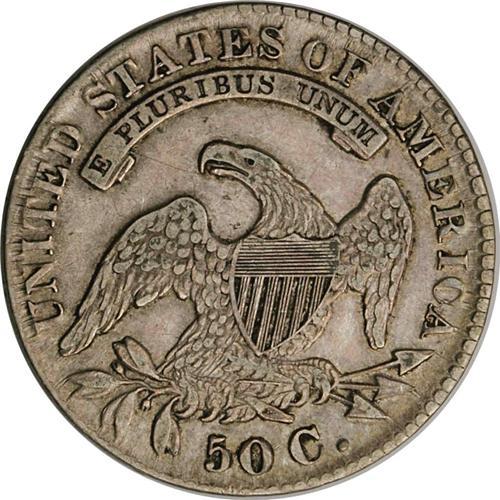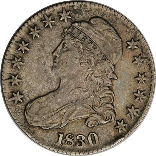<B>1830<50C> Large 0 AU50 NGC.</B></I> O-123, R.1. This variety is easily attributed by the numerous vertical lines that extend downward beyond the shield border. This dark greenish-gray example is struck from moderately eroded obverse and reverse dies. Some obverse die bulging is noted, and the reverse die is rotated counterclockwise by about 30 degrees.<BR><I>Ex: Eric Gutscher (12/10/1982).</B></I> Envelope Included.