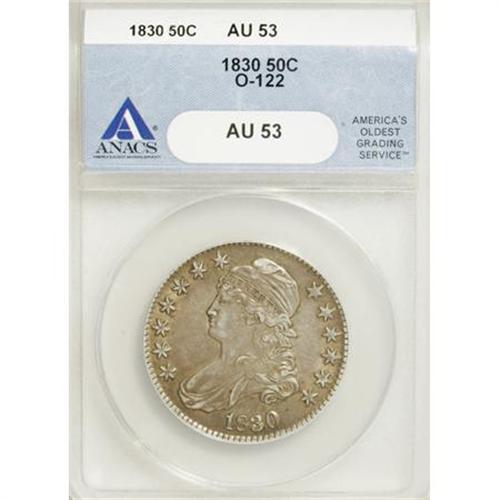 <B>1830 50C Large 0 AU53 ANACS.</B></I> O-122. NGC Census: 0 in 53, 0 finer (10/07). PCGS Population: 11 in 53, 113 finer (10/07).Mintage: 4,764,800. (#6157)<BR><BR><B>Coin Engraver:</B> John Reich<BR><BR><b>Shipping:</b> Coins & Currency (<a target="_blank" href="http://www.heritageauctions.com/common/shipping.php">view shipping information</a>)