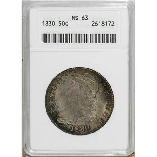 <B>1830 50C Large 0 MS63 ANACS.</B></I> O-121, R.3. This well struck Mint State example reveals richly, originally toned surfaces on both obverse and reverse. The coin seems minimally abraded, for the assigned grade, and substantial luster shimmers beneath the deep patina.<BR><BR><B>Coin Engraver:</B> John Reich<BR><BR><b>Shipping:</b> Coins & Currency (<a target="_blank" href="http://www.heritageauctions.com/common/shipping.php">view shipping information</a>)