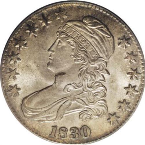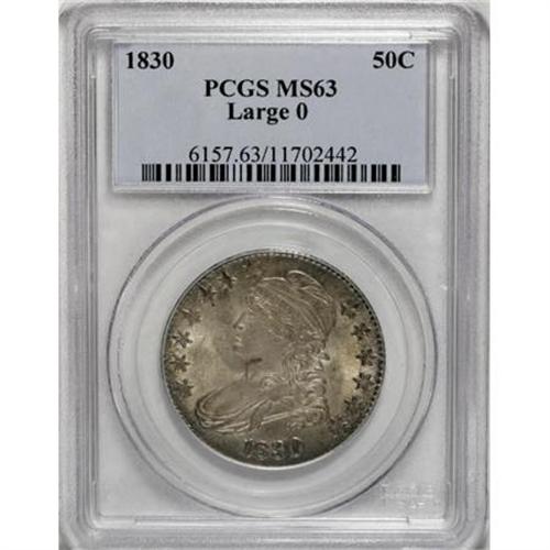 <B>1830 50C Large 0 MS63 PCGS.</B></I> O-121, R.3. O-120 and O-121 are fiendishly difficult to distinguish, but the high 3 in the date and the soft left-side stars are characteristic of the scarcer O-121. Attractively toned in caramel-gold and ice-blue. Lustrous and crisply struck with a few wispy thin marks on the left obverse field. Population: 12 in 63, 28 finer (8/07).<BR><BR><B>Coin Engraver:</B> John Reich<BR><BR><b>Shipping:</b> Coins & Currency (<a target="_blank" href="http://www.heritageauctions.com/common/shipping.php">view shipping information</a>)