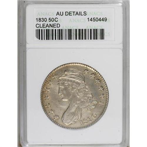 <B>1830 50C Small 0--Cleaned--ANACS. AU Details.</B></I> NGC Census: (73/996). PCGS Population (100/659). Mintage: 4,764,800. Numismedia Wsl. Price for NGC/PCGS coin in AU50: $221. (#6156)<BR><BR><B>Coin Engraver:</B> John Reich<BR><BR><b>Shipping:</b> Coins & Currency (<a target="_blank" href="http://www.heritageauctions.com/common/shipping.php">view shipping information</a>)