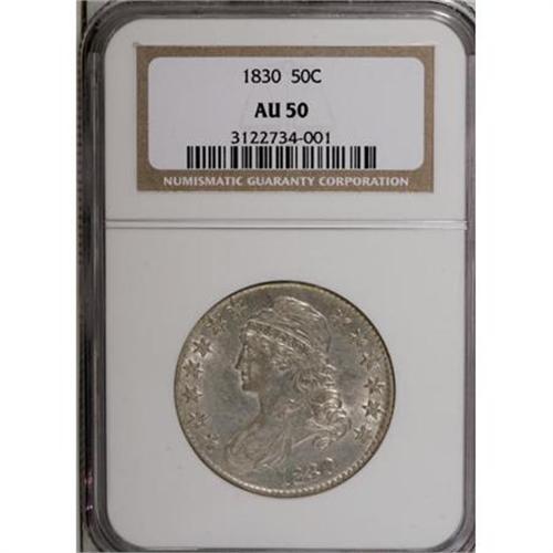 <B>1830 50C Small 0 AU50 NGC.</B></I> NGC Census: (74/1013). PCGS Population (100/669). Mintage: 4,764,800. Numismedia Wsl. Price for NGC/PCGS coin in AU50: $325. (#6156)<BR><BR><B>Coin Engraver:</B> John Reich<BR><BR><b>Shipping:</b> Coins & Currency (<a target="_blank" href="http://www.heritageauctions.com/common/shipping.php">view shipping information</a>)