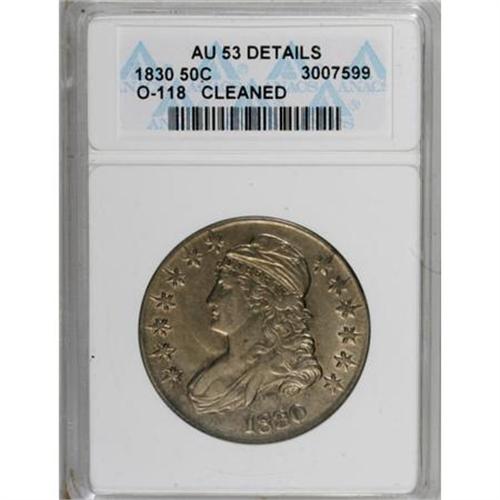 <B>1830 50C Small 0--Cleaned--ANACS. AU53 Details. </B></I>O-118. NGC Census: (95/901). PCGS Population (66/585). Mintage: 4,764,800. Numismedia Wsl. Price for NGC/PCGS coin in AU53: $233. (#6156)<BR><BR><B>Coin Engraver:</B> John Reich<BR><BR><b>Shipping:</b> Coins & Currency (<a target="_blank" href="http://www.heritageauctions.com/common/shipping.php">view shipping information</a>)