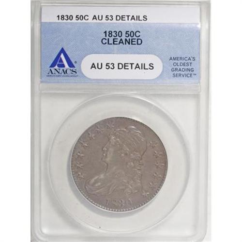 <B>1830 50C Small 0--Cleaned--ANACS. AU53 Details.</B></I> O-102. NGC Census: (96/912). PCGS Population (67/593). Mintage: 4,764,800. Numismedia Wsl. Price for NGC/PCGS coin in AU53: $233. (#6156)<BR><BR><B>Coin Engraver:</B> John Reich<BR><BR><b>Shipping:</b> Coins & Currency (<a target="_blank" href="http://www.heritageauctions.com/common/shipping.php">view shipping information</a>)