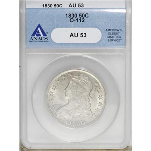 <B>1830 50C Small 0 AU53 ANACS.</B></I> O-112. NGC Census: (96/911). PCGS Population (67/597). Mintage: 4,764,800. Numismedia Wsl. Price for NGC/PCGS coin in AU53: $350. (#6156)<BR><BR><B>Coin Engraver:</B> John Reich<BR><BR><b>Shipping:</b> Coins & Currency (<a target="_blank" href="http://www.heritageauctions.com/common/shipping.php">view shipping information</a>)
