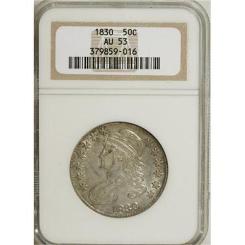 <B>1830 50C Small 0 AU53 NGC.</B></I> NGC Census: (95/901). PCGS Population (66/585). Mintage: 4,764,800. Numismedia Wsl. Price for NGC/PCGS coin in AU53: $233. (#6156)<BR><BR><B>Coin Engraver:</B> John Reich<BR><BR><b>Shipping:</b> Coins & Currency (<a target="_blank" href="http://www.heritageauctions.com/common/shipping.php">view shipping information</a>)