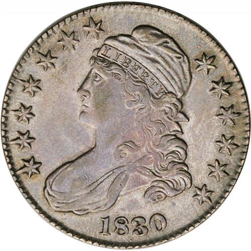 <B>1830<50C> Small 0 AU55 NGC.</B></I> O-108, R.3. This piece shows the following diagnostics that are consistent with the variety: there is a fine circular line in the upper loop of the 8 of the date; the 18 of the date is higher than the 30; there is a dot below the date between the 8 and the 3 near the milling; the left sides of the second T in STATES and the I in PLURIBUS are in line; and the lines in stripe 6 extend below the shield. All of the milling shows on this example, though it is somewhat narrow around the upper obverse. The design elements are well struck, with just a touch of softness in Liberty's upper hair curls. A richly toned specimen with blue-gray shades that exhibit crimson and golden highlights as the coin turns under a light. Light wear shows on the highpoints. Envelope Included.