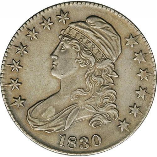 <B>1830<50C> Small 0 AU55 NGC.</B></I> O-115, R.2. This appears to be a later die state, as the die defect lines that are normally seen in front of the bust have been lapped away. The longest tailfeather pierces the olive branch and several of the vertical lines in the shield extend below the shield's lower border. Some weakness is seen on the stars on the right side of the obverse. A pleasant, bright coin with some gray-golden patina.<BR><I>Ex: Slawik (4/28/1983).</B></I> Envelope Included.