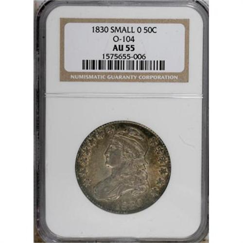 <B>1830 50C Small 0 AU55 NGC.</B></I> O-104. NGC Census: (153/745). PCGS Population (156/426). Mintage: 4,764,800. Numismedia Wsl. Price for NGC/PCGS coin in AU55: $350. (#6156)<BR><BR><B>Coin Engraver:</B> John Reich<BR><BR><b>Shipping:</b> Coins & Currency (<a target="_blank" href="http://www.heritageauctions.com/common/shipping.php">view shipping information</a>)