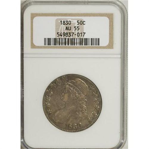 <B>1830 50C Small 0 AU55 NGC.</B></I> NGC Census: (154/747). PCGS Population (157/428). Mintage: 4,764,800. Numismedia Wsl. Price for NGC/PCGS coin in AU55: $350. (#6156)<BR><BR><B>Coin Engraver:</B> John Reich<BR><BR><b>Shipping:</b> Coins & Currency (<a target="_blank" href="http://www.heritageauctions.com/common/shipping.php">view shipping information</a>)