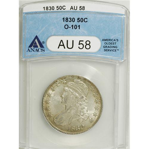 <B>1830 50C Small 0 AU58 ANACS.</B></I> O-101. NGC Census: (326/405). PCGS Population (153/262). Mintage: 4,764,800. Numismedia Wsl. Price: $575. (#6156)<BR><BR><b>Shipping:</b> Coins & Currency (<a target="_blank" href="http://www.heritageauctions.com/common/shipping.php">view shipping information</a>)