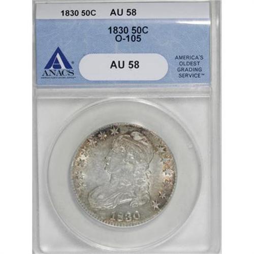 <B>1830 50C Small 0 AU58 ANACS.</B></I> O-105. NGC Census: (330/428). PCGS Population (165/270). Mintage: 4,764,800. Numismedia Wsl. Price for NGC/PCGS coin in AU58: $575. (#6156)<BR><BR><B>Coin Engraver:</B> John Reich<BR><BR><b>Shipping:</b> Coins & Currency (<a target="_blank" href="http://www.heritageauctions.com/common/shipping.php">view shipping information</a>)
