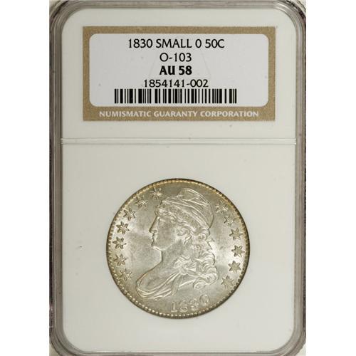 <B>1830 50C Small 0 AU58 NGC.</B></I> O-103. NGC Census: (654/814). PCGS Population (154/263). Mintage: 4,764,800. Numismedia Wsl. Price for NGC/PCGS coin in AU58: $575. (#6156)<BR><BR><b>Shipping:</b> Coins & Currency (<a target="_blank" href="http://www.heritageauctions.com/common/shipping.php">view shipping information</a>)