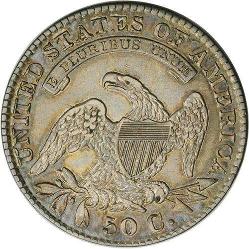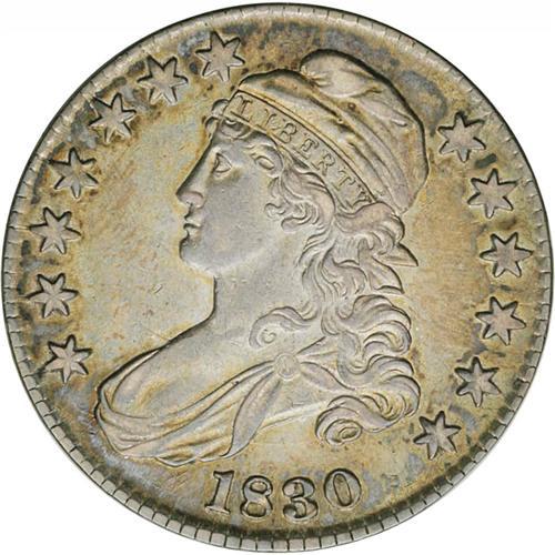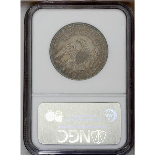 <B>1830<50C> Small 0 AU58 NGC.</B></I> O-115, R.2. The diagnostic die lines are clearly visible at the point of the bust and to the left of the date. This was caused by the implementation of an unfinished die in production. Slight wear shows on the highpoints and minor clashing shows on each side. One lateral mark is visible just above the eagle's head. Deep golden-brown and charcoal-gray toning decorates each side.<BR><I>Ex: Stack's (9/10/1987).</B></I> Envelope Included.