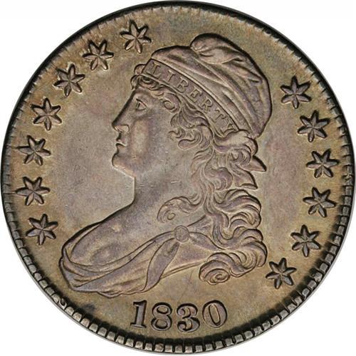 <B>1830<50C> Medium 0 AU58 NGC.</B></I> O-119, R.1. The A in STATES is partially filled at the top, and the 0 in the date shows recutting at the upper left portion. The top of the shield is weak, as is typical for the O-119. A richly toned specimen with nearly full luster under the colors. Worthy of a premium bid by the Capped Bust Half Dollar enthusiast. Envelope Included.