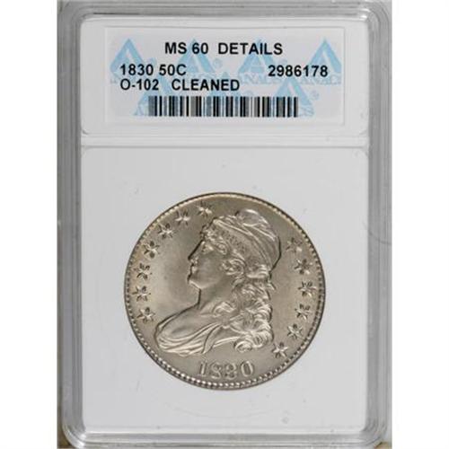 <B>1830 50C Small 0--Cleaned--ANACS. MS60 Details.</B></I> O-102. NGC Census: (7/403). PCGS Population (11/252). Mintage: 4,764,800. Numismedia Wsl. Price for NGC/PCGS coin in MS60: $685. (#6156)<BR><BR><B>Coin Engraver:</B> John Reich<BR><BR><b>Shipping:</b> Coins & Currency (<a target="_blank" href="http://www.heritageauctions.com/common/shipping.php">view shipping information</a>\)