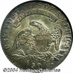 <B>1830<50C> Small 0 MS64 NGC.</B></I> O-117, R.2. This lustrous, well struck coin displays deep, luscious olive-gray coloration near the centers, with rose and dark-green accents near some of the peripheral areas. A long, curved toning streak extends from near the lower obverse rim, at six o'clock, to just behind Liberty's head. Otherwise, the graciously preserved surfaces seem to be nearly undisturbed on both obverse and reverse. Population: 96 in 64, 34 finer (7/04). <BR><BR><B>Important notice:</B> Heritage usually auctions material at the rate of 200-250 lots per hour. On some occasions eBay Live bid software or the Internet may not be able to keep up with the pace of the auction. We recommend placing a realistic absentee bid now as insurance to avoid disappointment. Occasionally the auctioneer may eliminate or reject an eBay Live bid, and the auctioneer may also reopen a lot after the close of the eBay live bidding (usually because we missed an audience bid), and may reject your bid even if it shows you as the winning bidder. By bidding via eBay Live, you agree that Heritage may award the lot to another bidder at its sole discretion under the circumstances described above or any other reasonable circumstances. Since eBay bids are not shown to us until we open the lot on the floor, we treat those bids just like floor bids. In most cases the floor responds before the eBay bid is presented to us, due to Internet lag time, so for consistency we have made it a policy that floor bids are always considered first over tie eBay live bids. Also please note that all Heritage lots purchased through eBay Live carry a 20% Buyer's Premium. Please make sure you read the Terms and Conditions before you bid. </span></font></tr></table></td></tr></table>