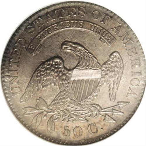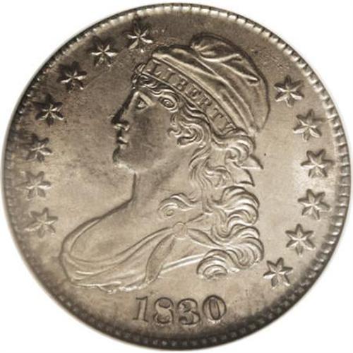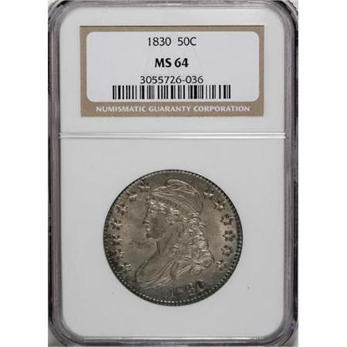 <B>1830 50C Small 0 MS64 NGC.</B></I> O-110, R.3. This obverse/reverse die pairing is a later usage of each, and each side shows patches of die rust. Several Uncirculated examples are known of this slightly scarcer variety, the finest apparently being an NGC MS66. This is a sharply defined example that has satiny luster and even gray-lilac toning over each side. <BR><BR><B>Coin Engraver:</B> John Reich<BR><BR><b>Shipping:</b> Coins & Currency (<a target="_blank" href="http://www.heritageauctions.com/common/shipping.php">view shipping information</a>)