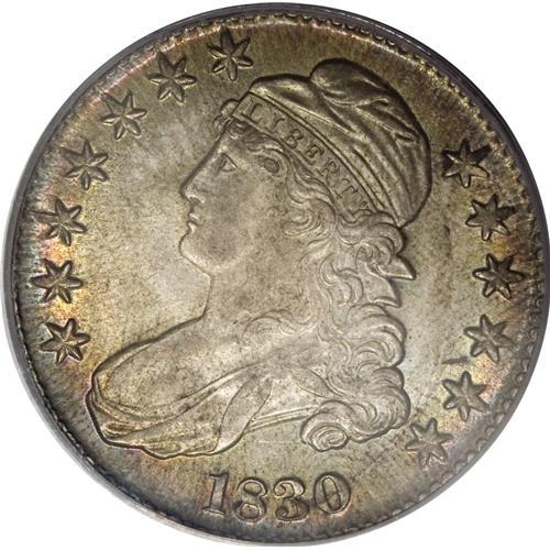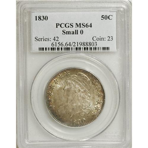 <B>1830 50C Small 0 MS64 PCGS.</B></I> O-117, R.2. Dappled olive and pearl-gray blend throughout the fields and devices, while the borders are rose-red. This sharply struck and lustrous piece is surprisingly free from marks, and only distributed faint obverse carbon precludes an even finer grade. Population: 65 in 64, 19 finer (3/07).<BR><BR><b>Shipping:</b> Coins & Currency (<a target="_blank" href="http://www.heritageauctions.com/common/shipping.php">view shipping information</a>)