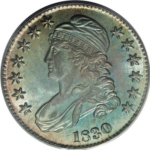 <B>1830 50C Small 0 MS65 PCGS.</B></I> O-117, R.2. One of the more obtainable 1830 Small O die pairings in Mint State, recognized in part by a barely perceptible "cross" in Liberty's forecurl between the upper and lower portions. Light recutting is also noted on the upright of the 5 in the denomination. This lustrous Gem example is overlaid in blue and yellow-gold pastel toning on the obverse, while the reverse incorporates deeper aqua and orange-rose shades. Solid Condition Census quality for the O-117 die marriage. Population: 13 in 65, 5 finer (11/06).<BR><I>From The Temecula Collection.</B></I><BR><BR><b>Shipping:</b> Coin/Currency (<a target="_blank" href="http://www.heritageauctions.com/common/shipping.php">view shipping information</a>)