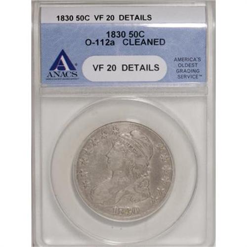 <B>1830 50C --Cleaned--ANACS. VF20 Details.</B></I> O-112a. NGC Census: (9/1305). PCGS Population (8/1006). Mintage: 4,764,800. Numismedia Wsl. Price for NGC/PCGS coin in VF20: $80. (#6156)<BR><BR><B>Coin Engraver:</B> John Reich<BR><BR><b>Shipping:</b> Coins & Currency (<a target="_blank" href="http://www.heritageauctions.com/common/shipping.php">view shipping information</a>)