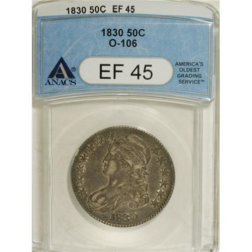 <B>1830 50C Small 0 XF45 ANACS.</B></I> O-106. NGC Census: (106/1045). PCGS Population (90/731). Mintage: 4,764,800. Numismedia Wsl. Price for NGC/PCGS coin in XF45: $124. (#6156)<BR><BR><b>Shipping:</b> Coins & Currency (<a target="_blank" href="http://www.heritageauctions.com/common/shipping.php">view shipping information</a>)